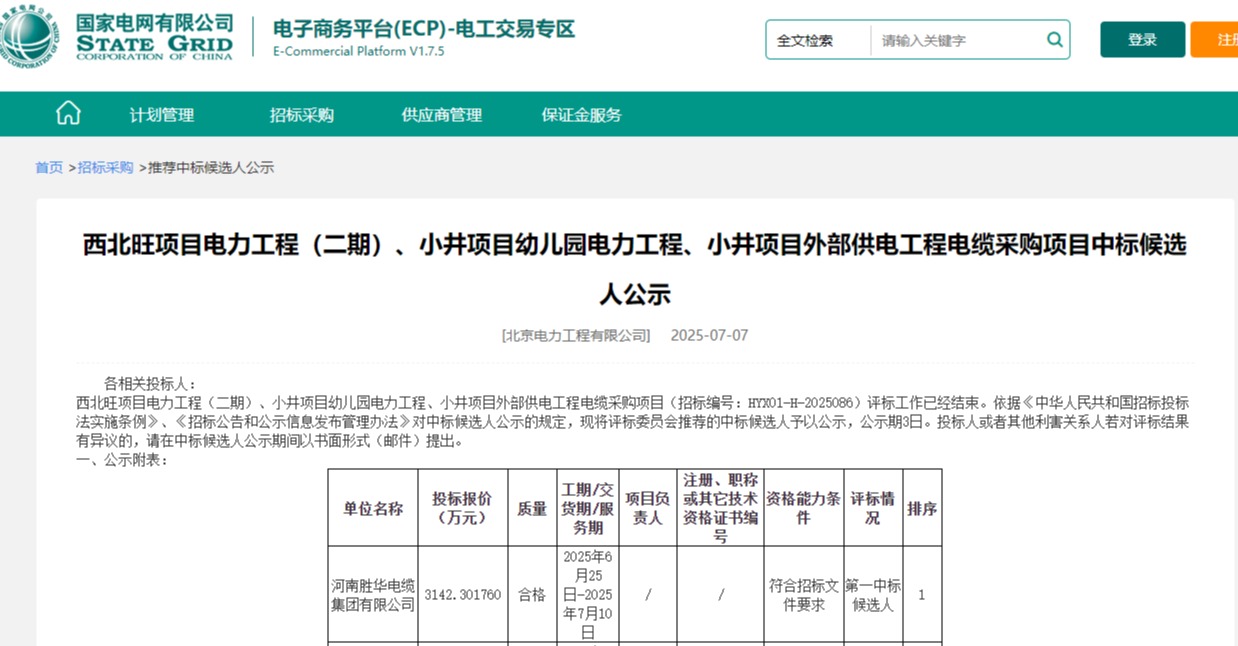 小编从国家电网有限公司电子商务平台获悉,在西北旺项目电力工程(二期)、小井项目幼儿园电力工程、小并项目外部供电工程电缆采购项目中,河南胜华电缆集团有限公司成功中标,金额为3142.301760万元。 河南胜华电缆集团此次能够中标,离不开其强大的技术实力和严格的品质管理。在技术研发上注重技术创新,不断投入研发资源,提升产品的性能和质量。在生产过程中,建立了完善的质量控制体系,从原材料采购到产品出厂,每一个环节都进行严格的检测和监控。正是这种对技术和品质的执着追求,使得胜华电缆在市场上具有强大的竞争力,赢得了客户的信任和认可。 河南胜华电缆集团多年来一直致力于电缆产品的研发、生产和销售,拥有先进的生产设备和专业的技术团队。在生产过程中,严格遵循国家标准和行业规范,确保每一根电缆都符合高质量要求。此次中标对于河南胜华电缆集团来说,是一个新的起点。未来将会以更加严谨的态度和更高的标准,以优质的产品、完善的售后服务,为项目的电力传输提供更加稳定、可靠的保障。 胜华电缆集团始建于1954年,中国机械制造500强,是一家非常有实力的电线电缆厂家,产品涵盖电线电缆型号几十万种,包括但不限于KVVP屏蔽控制电缆,ZR-YJV22铠装电力电缆,ZR-BVR,RVS,RVV聚氯乙烯绝缘护套家用布电线,YJLHV铝合金电缆,BTTZ矿用电缆,架空电缆,防火特种电缆等产品。所有产品都符合国家标准生产,质量有保障,优质电缆,选胜华电缆。